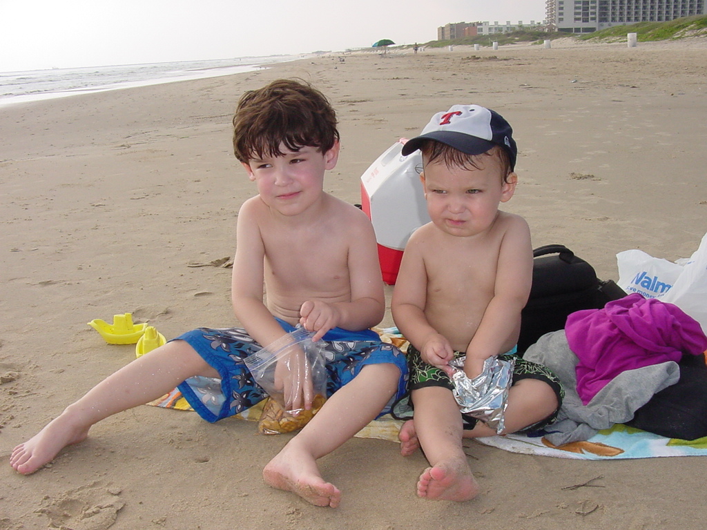 That last cloudy day was so much more fun. We each took a kid and walked way out on the sandbar to wave jump. The waves were bigger that far out, and Gabriel got a little scared. Then Gabriel and I made a volcano in front of our sand castle while Joel and Jav played soccer behind us.